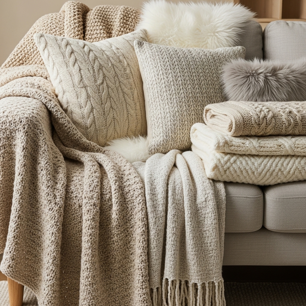 - Chunky knit throws layered over a clean-lined sofa