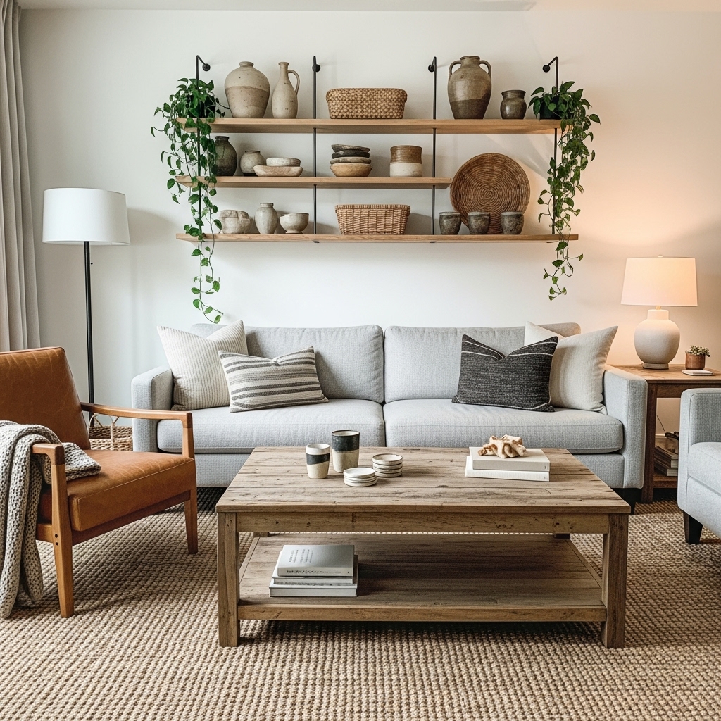Reclaimed wood beams, open shelving, coffee tables, and accent furniture bring raw texture into the space. The knots, grain patterns, and imperfections create a sense of authenticity.