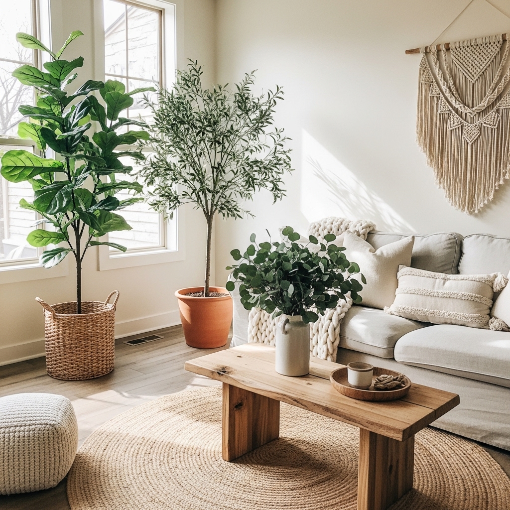- Tall floor plants like fiddle leaf figs, olive trees, or palms