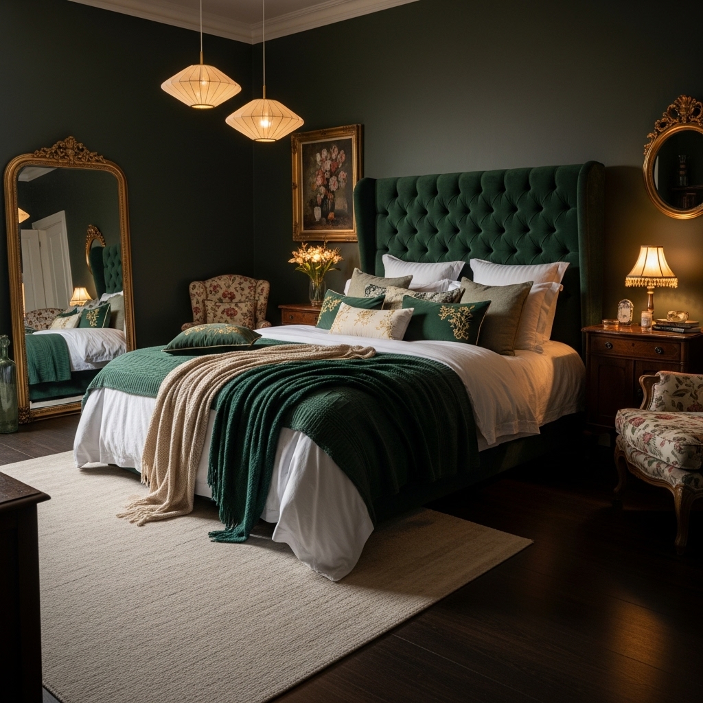 Start with a statement headboard—tufted velvet, carved wood, or metal with curved detailing. Soft, layered bedding creates a luxurious feel. Choose rich, moody wall colors like deep green, soft charcoal, or smoky blue, and balance them with crisp white bedding and metallic accents.