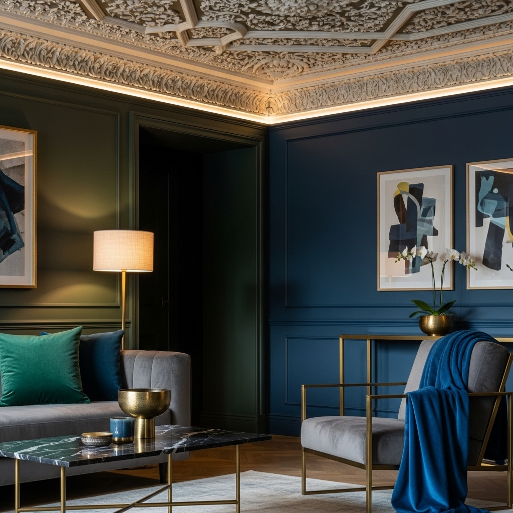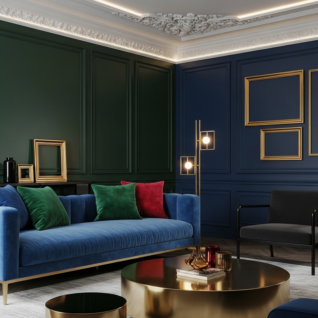 Start with a bold but balanced base. A neutral wall color can be elevated with board-and-batten wall trim or picture-frame molding. Add a dramatic velvet sofa in jewel tones such as emerald or sapphire. Pair it with a sleek, modern coffee table in marble, glass, or metal.