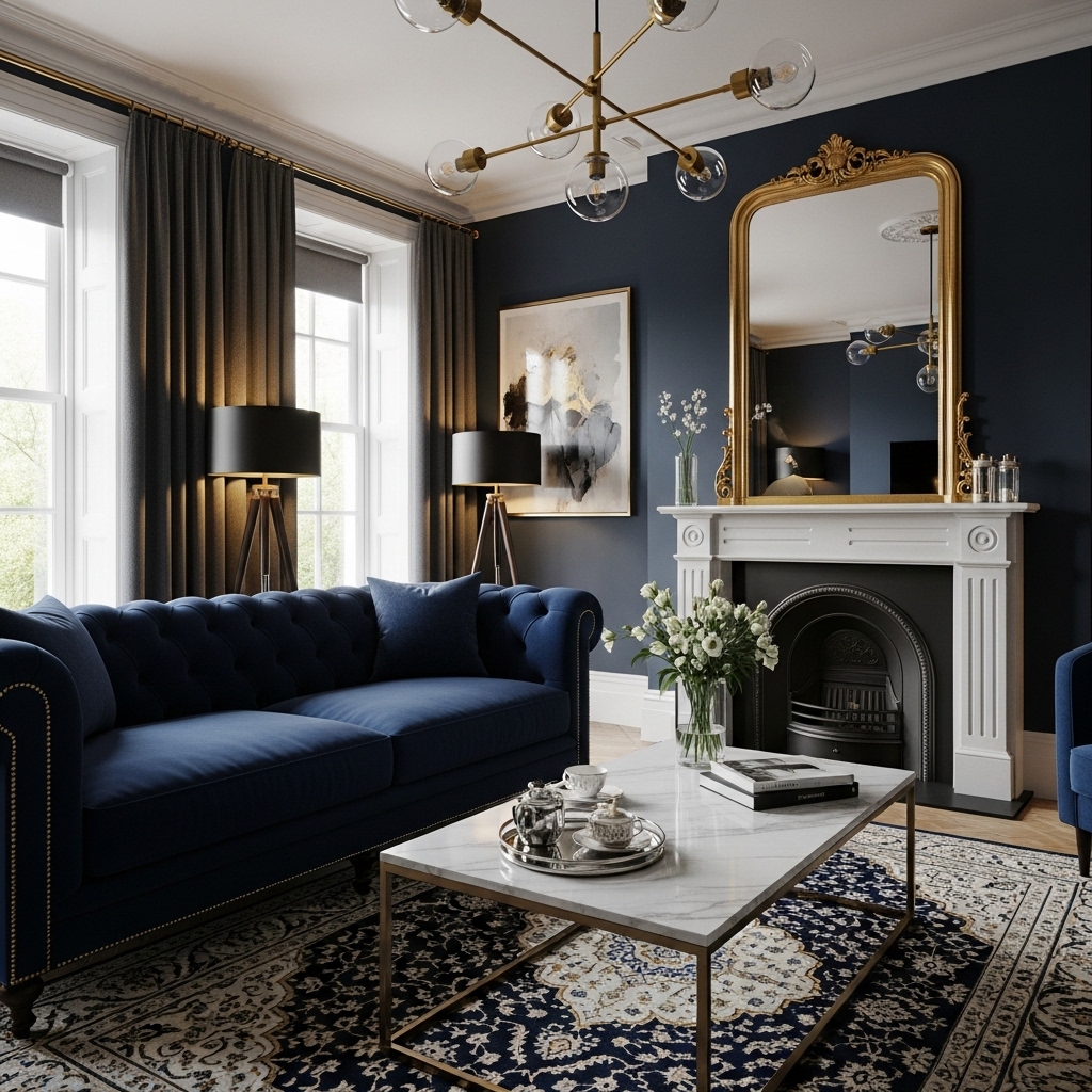 Layering is essential. Use patterned throw pillows, a textured rug, and soft drapery to build depth. A vintage-inspired mirror or an ornate gold frame above the fireplace makes a striking focal point, while modern lighting fixtures keep the look fresh and contemporary.