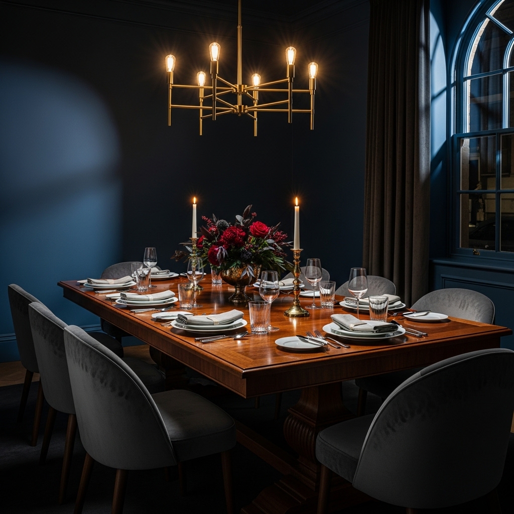 A solid wood dining table paired with modern upholstered chairs creates an elegant contrast. Choose a bold centerpiece such as a brass chandelier or a sculptural pendant light. Dark walls or wallpaper with subtle patterns work well in dining rooms, adding a sense of intimacy and luxury.