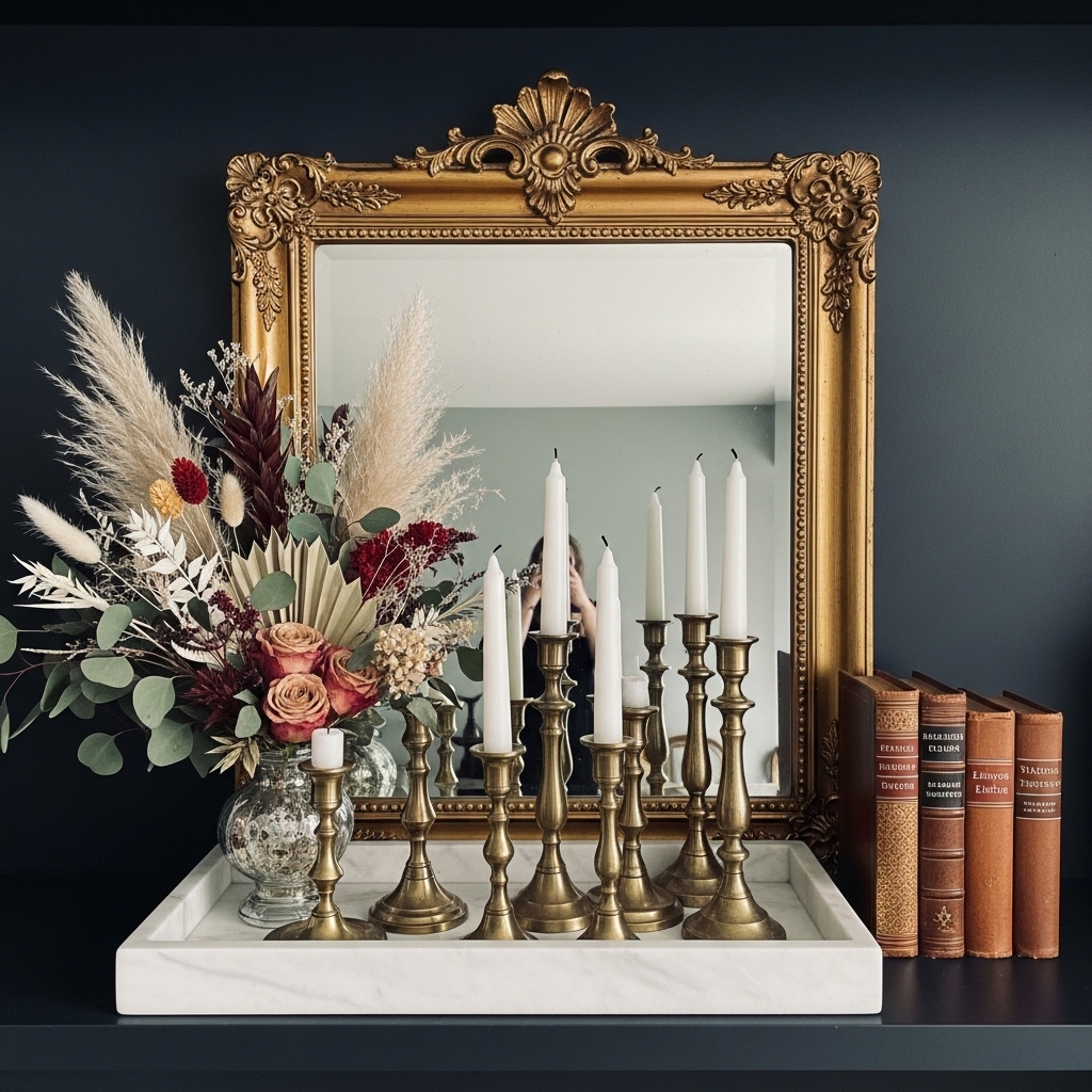 Think antique-style mirrors, framed art, marble trays, brass candle holders, sculptural vases, and layered textiles. Florals—both real and dried—are a classic Victorian touch that still feels fresh in modern spaces.