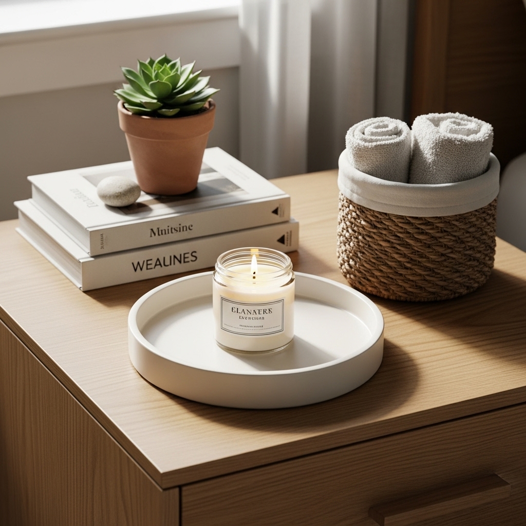 Add a ceramic tray to hold jewelry, a woven basket for storage, or a scented candle for ambience. These accents make your room functional and personal without disturbing the balance.
