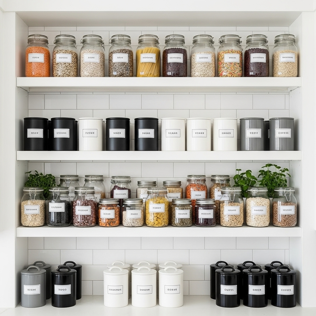 Uniformity is your best friend when styling open shelves. Matching jars, canisters, or containers create a sense of structure—even if they hold different items.