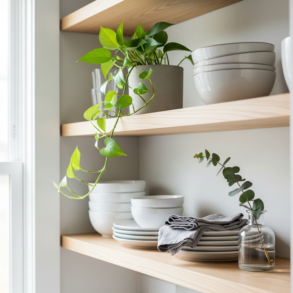 Plants bring life to open shelving, but too many can overwhelm the space. Stick to one small plant per shelf—or even every other shelf.