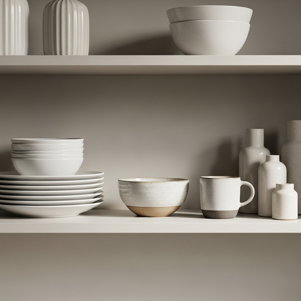 This doesn’t mean your kitchen has to feel boring. Texture can replace color—think matte ceramics, ribbed glass, or lightly speckled pottery.