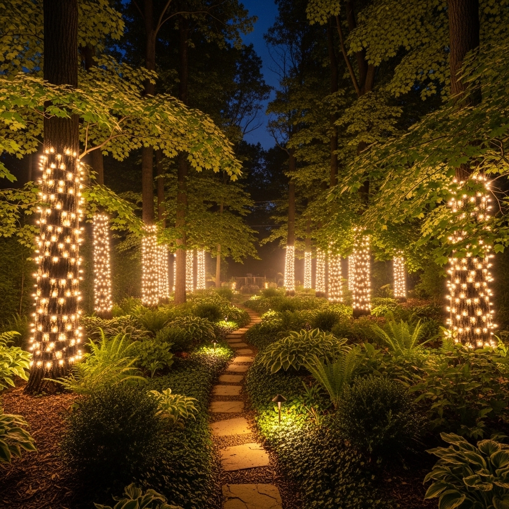 One of the most charming ways to use outdoor string lights is by wrapping them around tree trunks and branches. This adds a whimsical, forest-like glow and creates magical pathways or gathering spots. For best results, use warm white LEDs that highlight the natural beauty of the trees without overpowering the space. This idea works well year-round and is especially stunning during late-night summer gatherings.