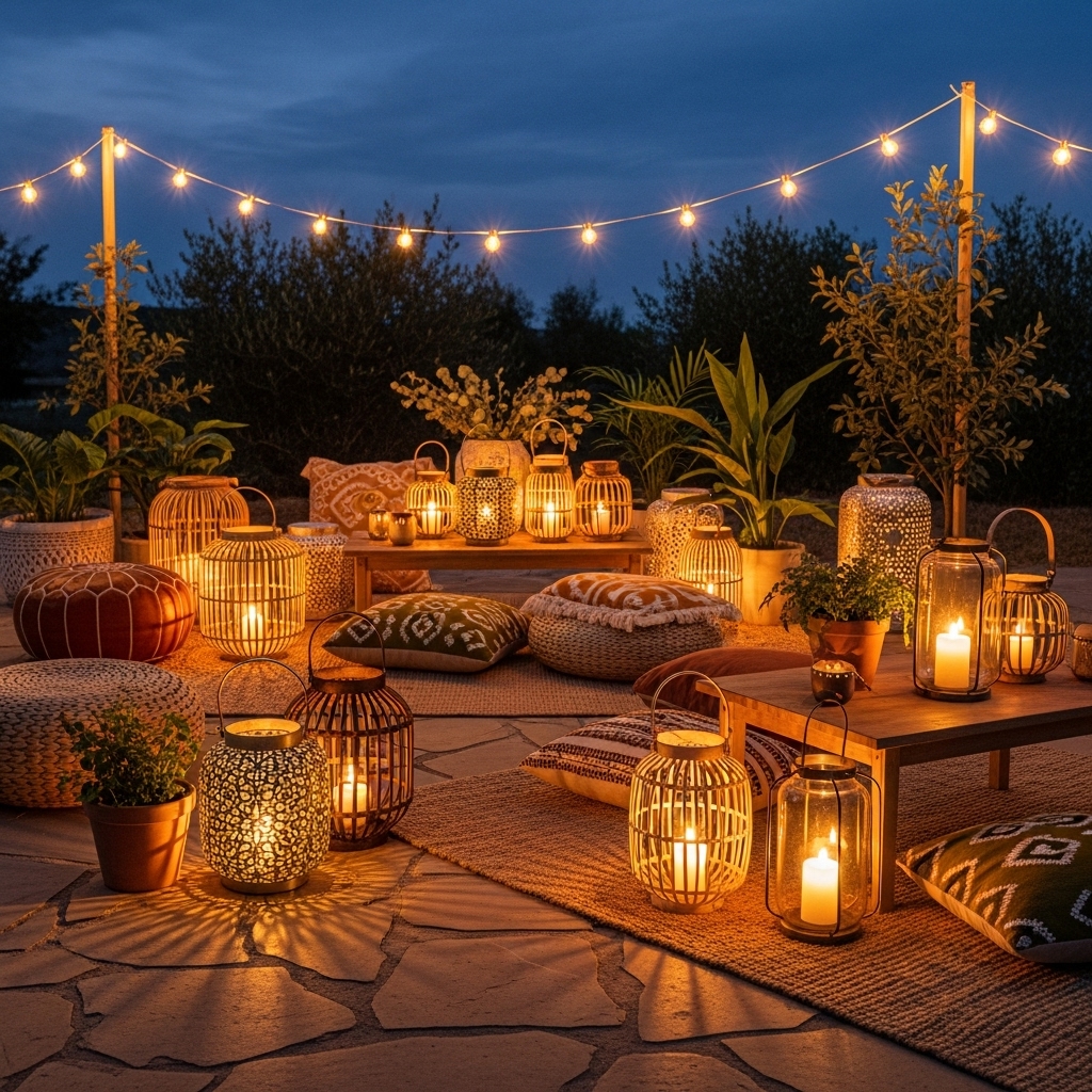 For a layered lighting effect that looks professionally designed, mix string lights with lanterns, candles, or solar lamps. Layering different light sources creates depth, texture, and visual interest. Use lanterns on tabletops, stairs, or along pathways while letting string lights fill the overhead space. This combination works especially well for boho, rustic, or modern outdoor styles.