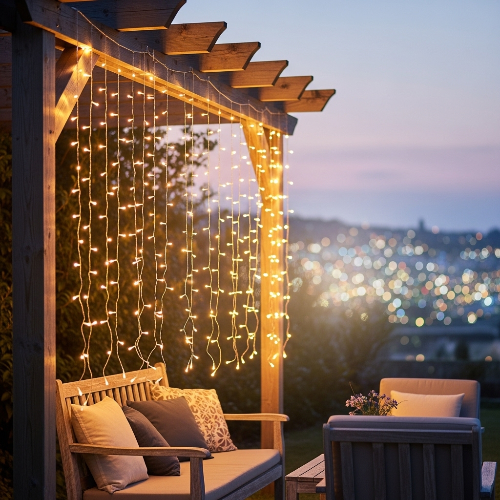 Curtain-style string lights are perfect for adding movement and elegance. Hang them vertically along a fence, patio wall, balcony railing, or pergola side for a soft, cascading effect. These are incredibly popular for romantic setups, wedding-style décor, or enhancing evening relaxation areas. If you’re looking for an easy way to instantly elevate your outdoor space, curtain lights deliver maximum impact with minimal effort.