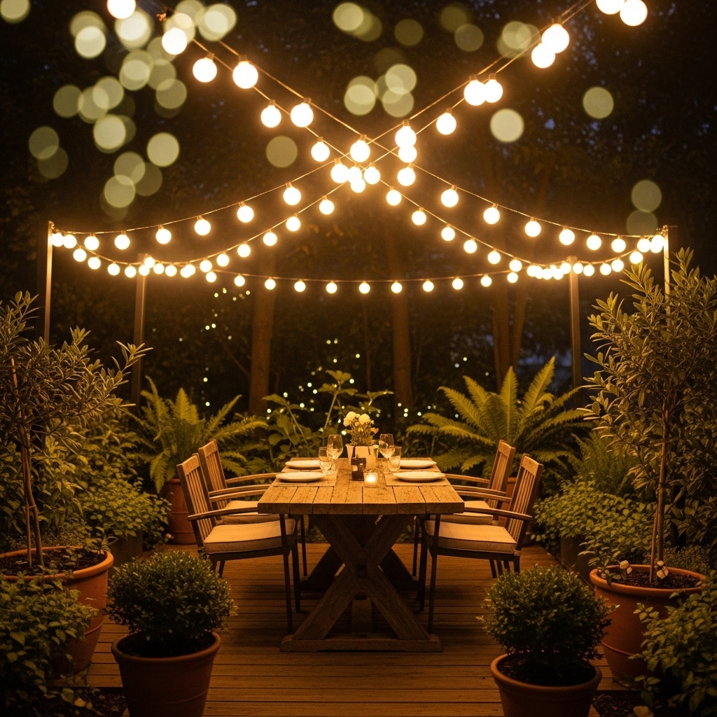 Nothing says “cozy evening” quite like café-inspired lighting. Globe string lights—featuring round, warm bulbs—provide a soft, inviting glow perfect for backyard gatherings. Hang them crisscrossed overhead or in straight lines for a modern look. If you have a pergola, wrap them around the beams for added dimension. This setup creates the perfect ambiance for dining, entertaining, or simply enjoying a peaceful night outdoors.