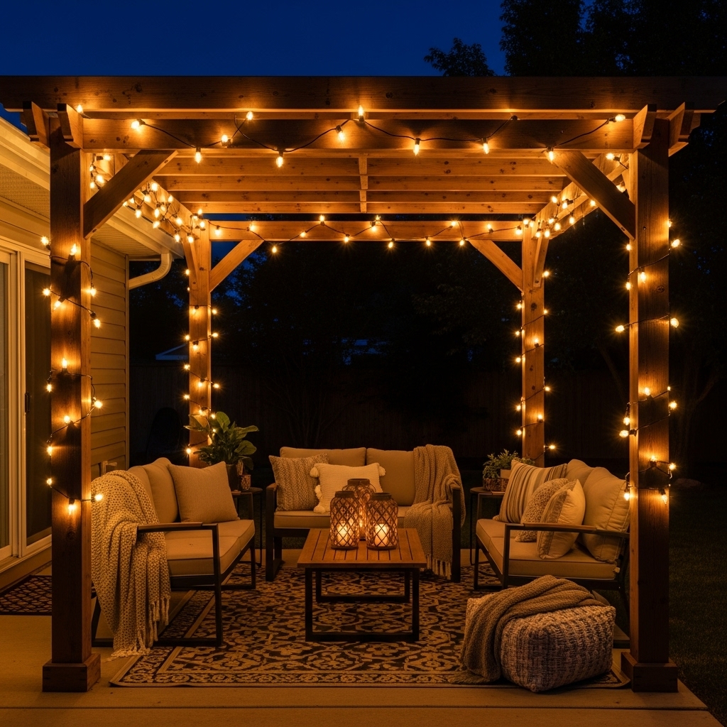 Create a cozy nook by framing your seating area with string lights. Hang them around pergola posts, wrap them around a porch swing frame, or place them around a gazebo entrance. This technique draws attention to the space and makes it feel like an intentionally designed retreat. Add outdoor pillows, a rug, and a small table, and you have a perfect spot for late-night lounging or morning coffee.