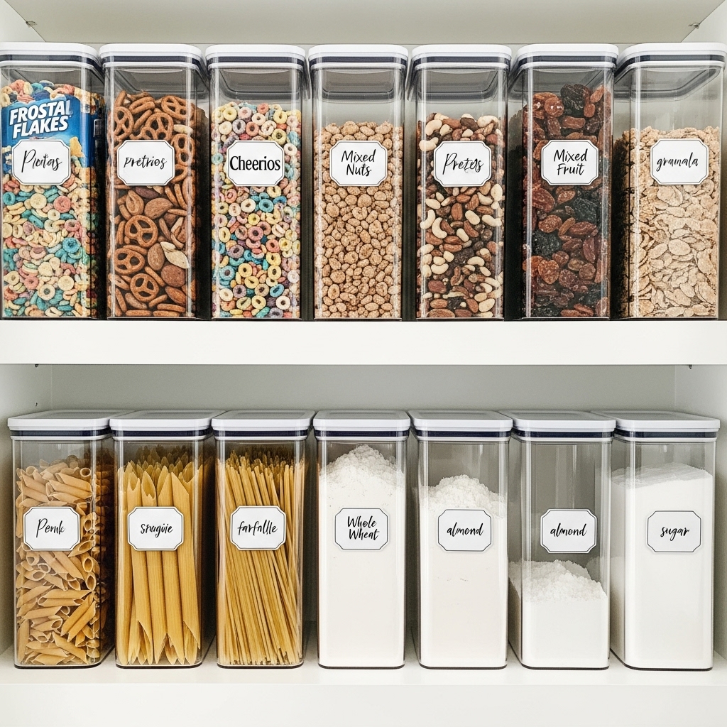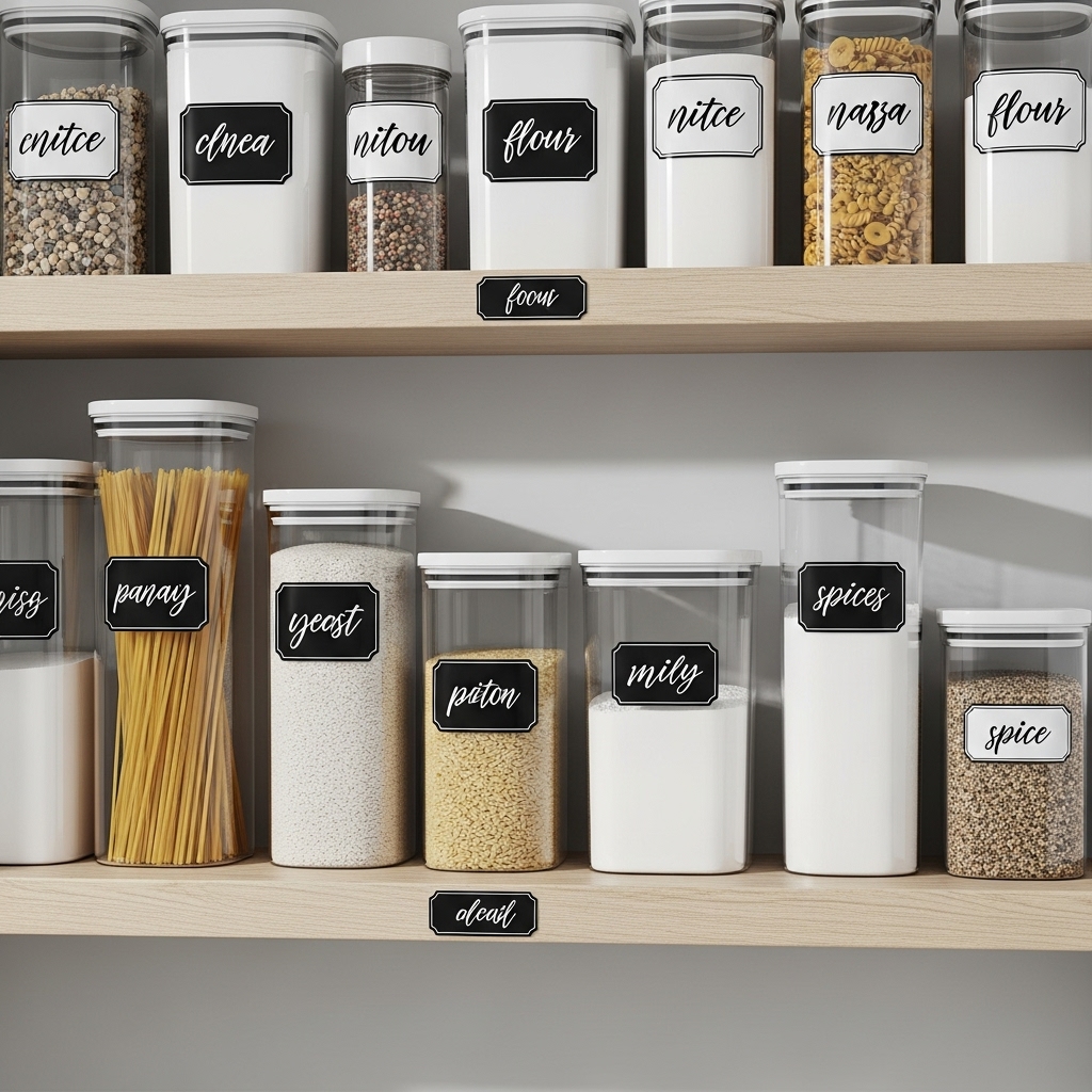 Labels are both stylish and functional. They prevent family members from putting items back in the wrong place and keep your pantry system consistent. You can purchase pre-made labels, create your own with a label maker, or print chic script designs from Etsy.