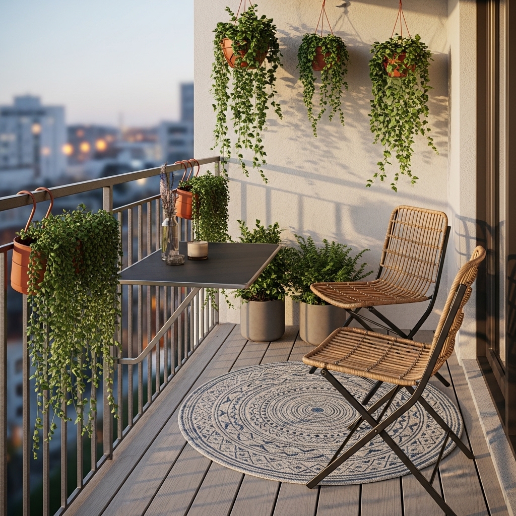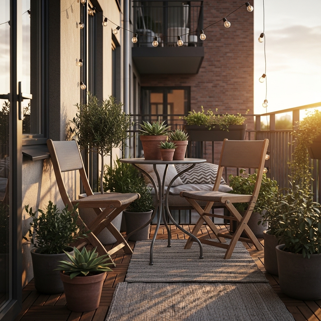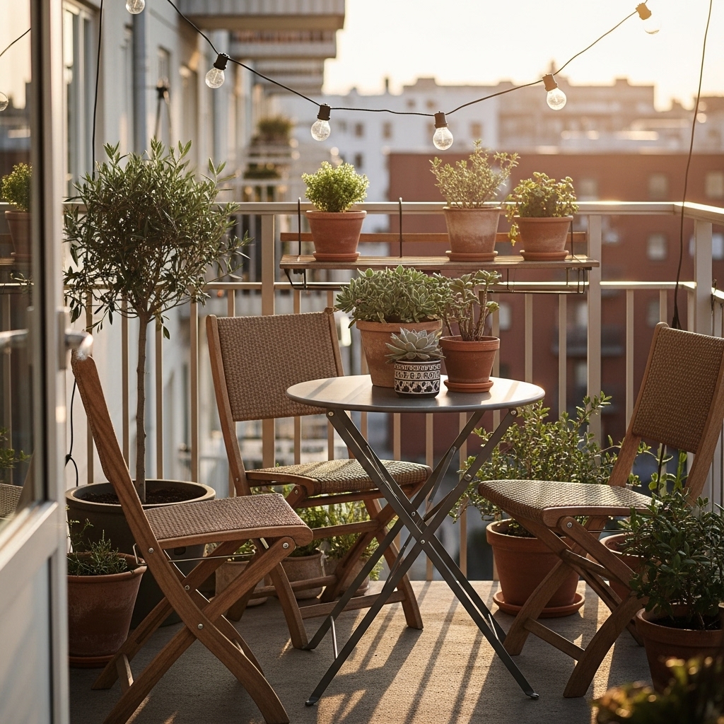 Choose foldable furniture and railing-mounted tables. Corner chairs and wall shelves help preserve floor space while maintaining functionality.