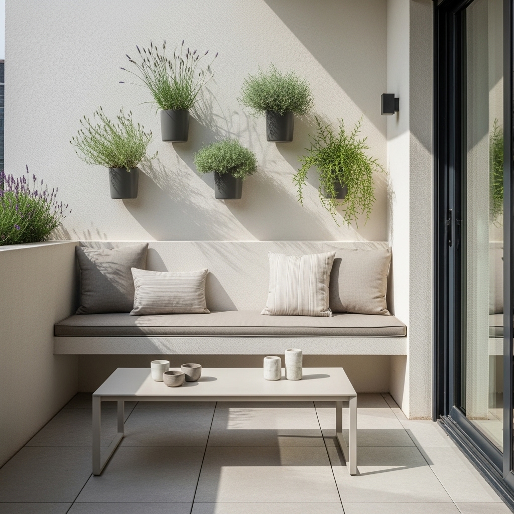 Placing furniture in a corner leaves the center of your patio open, creating the illusion of more space. A small corner sofa or two compact chairs with a triangular side table keeps traffic flow open and makes the patio feel breathable.