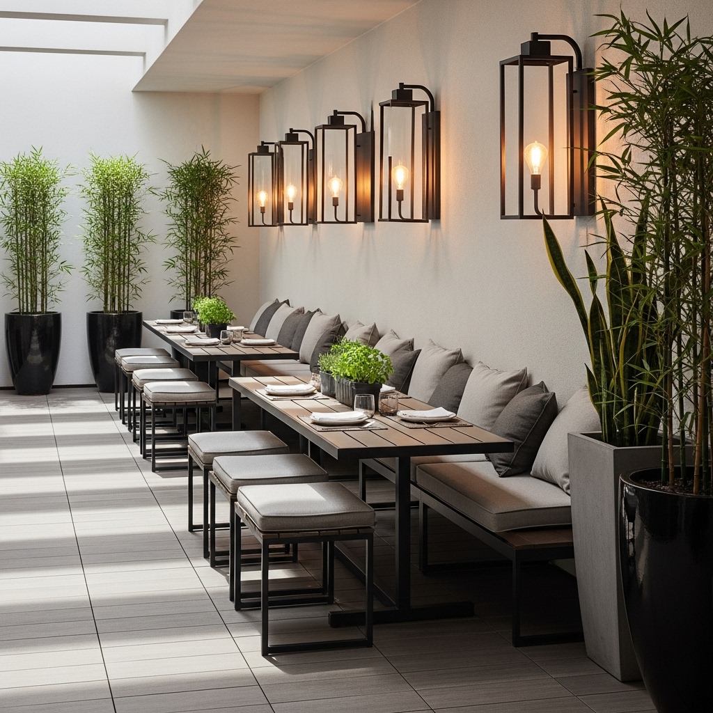 Vertical elements draw the eye upward, making the patio feel taller and more open. This simple trick dramatically enhances small outdoor layouts.