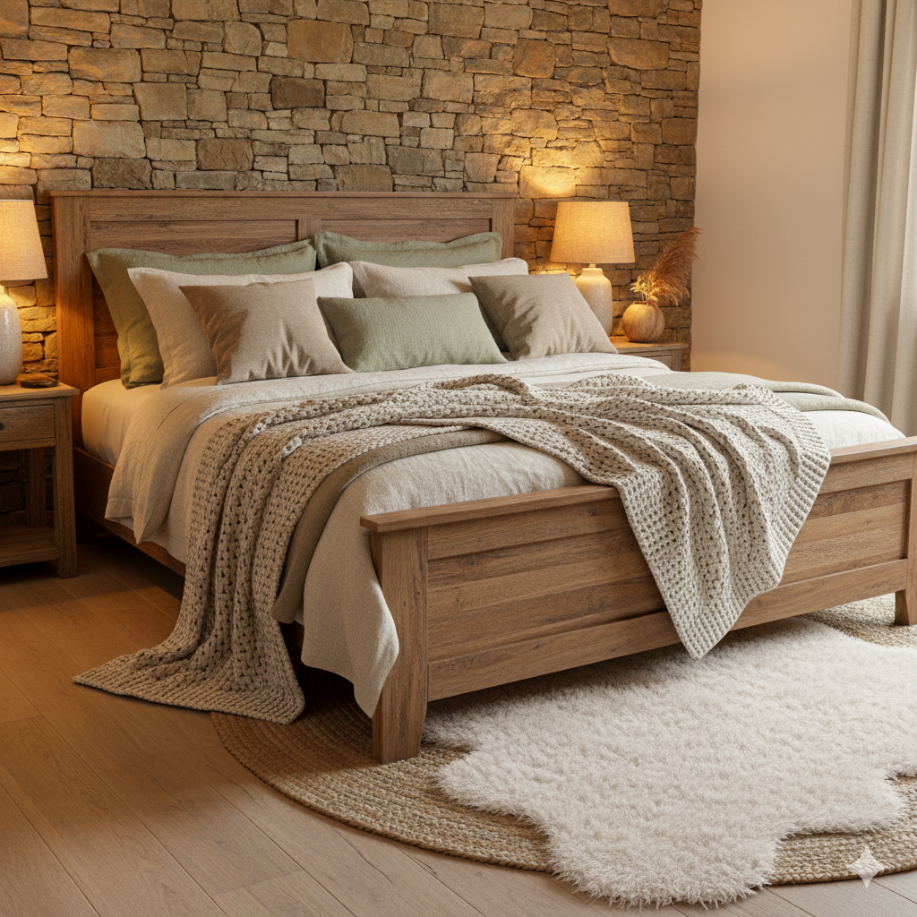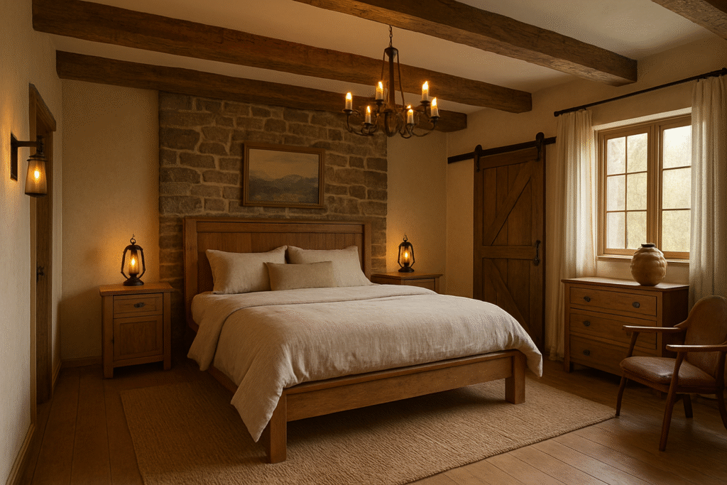 • Seating: Add a rustic bench at the foot of the bed or a leather chair in the corner.
