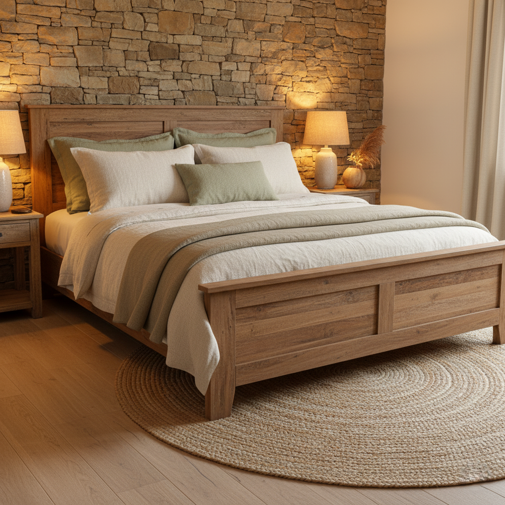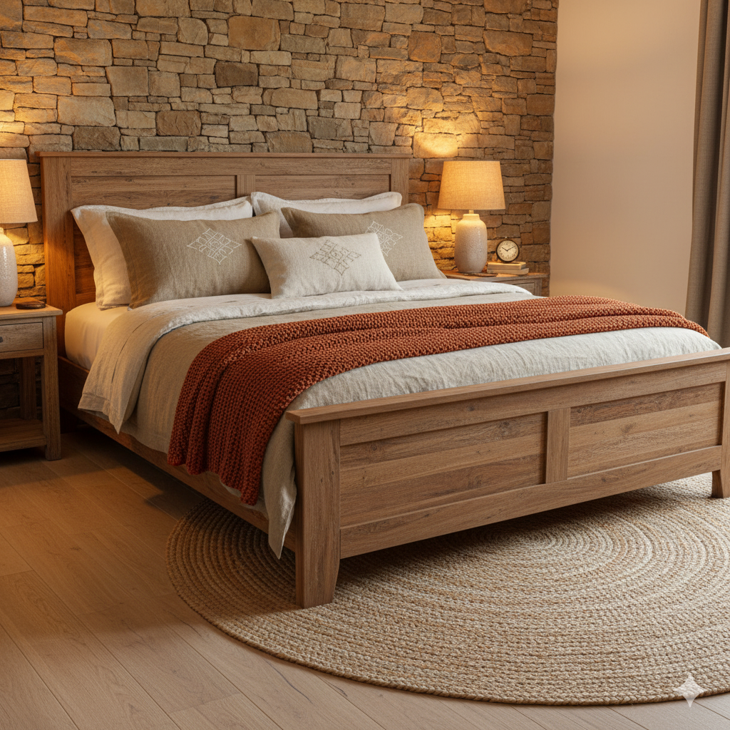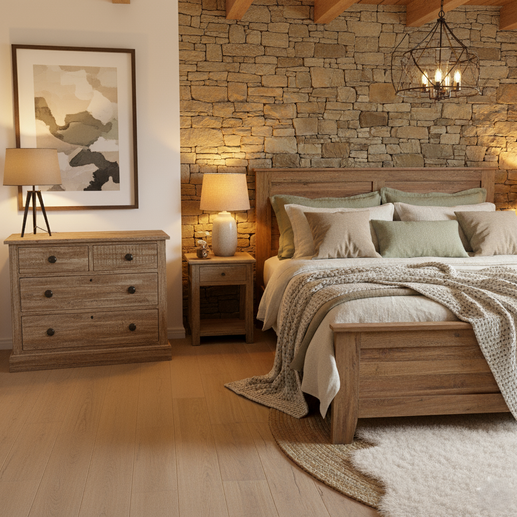 • Wooden Headboard & Furniture: A reclaimed wood headboard or nightstand instantly sets the tone for rustic design.