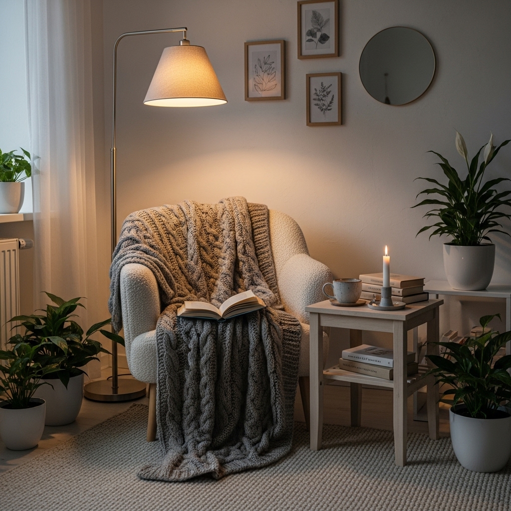 Every Scandinavian home has a “hygge corner” — a cozy nook for reading, sipping tea, or simply relaxing. Create your own by pairing a soft armchair with a floor lamp, side table, and throw blanket. Keep it simple yet inviting.