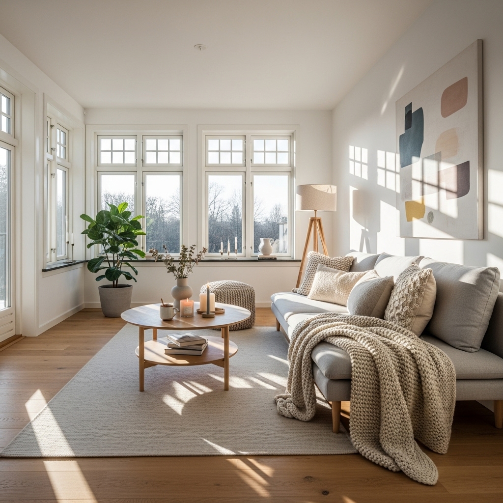One of the easiest ways to capture Scandinavian coziness — or “hygge” — is through texture. Mix wool, linen, jute, and cotton in similar color tones to create depth without chaos. Layering different materials adds visual warmth while keeping the palette calm.