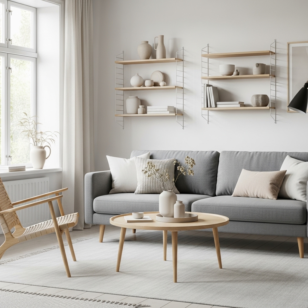 For a cozier twist, layer warm wood tones through furniture legs, shelving, and frames. Light oak and ash wood are especially popular in Nordic interiors because they balance the coolness of whites and grays.