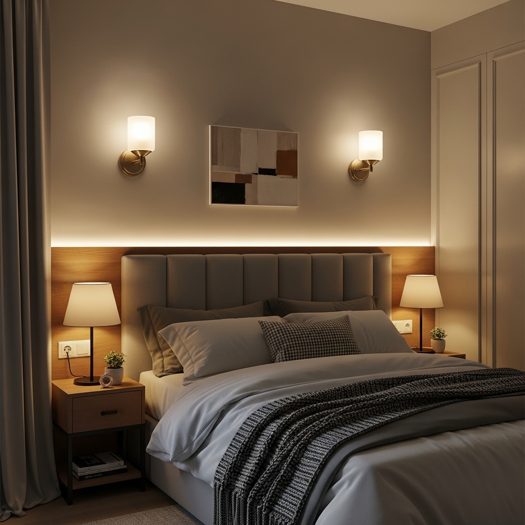 Lighting plays a huge role in making a bedroom feel bigger and more inviting. Instead of relying solely on overhead lighting, layering multiple light sources gives your room depth and ambiance.