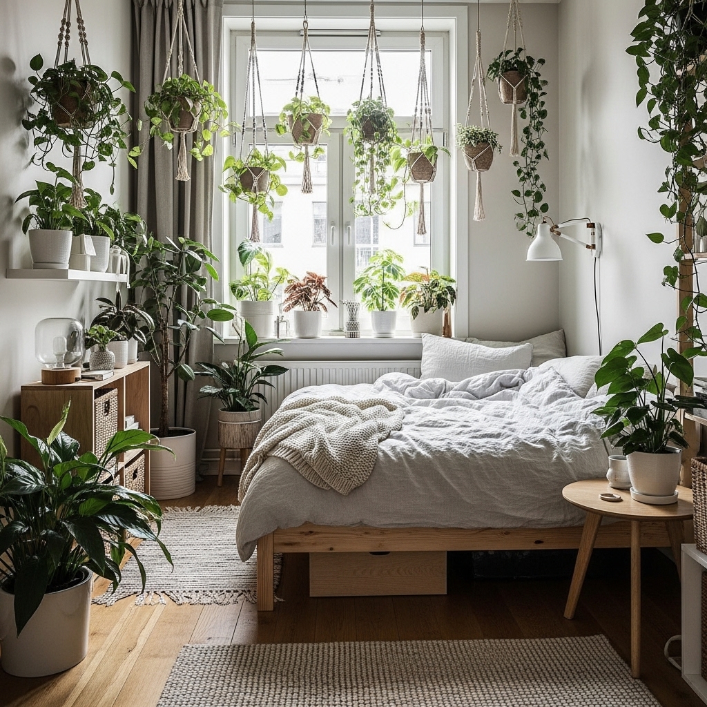 Use hanging planters, wall-mounted pots, or narrow plant stands to avoid cluttering your floors or nightstands.