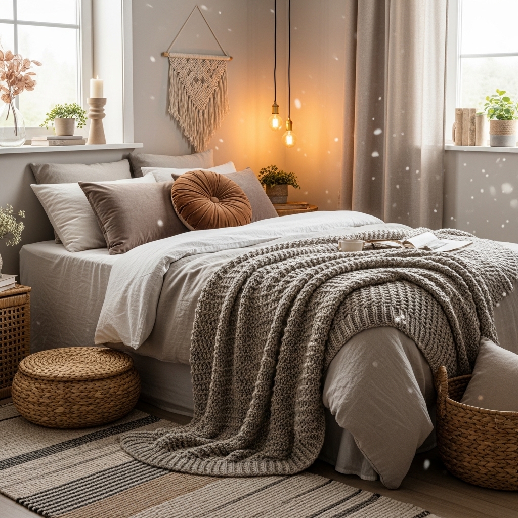 Even when working with a small space, you can create depth and interest through layered textures rather than bulky accessories. Soft knits, linen bedding, velvet pillows, woven baskets, or a faux fur throw add warmth without overwhelming the room.