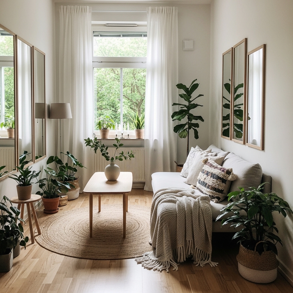 Mirrors are one of the most effective Small Space Home Decor Hacks for making any room appear larger. They reflect light, expand sightlines, and create a sense of openness.