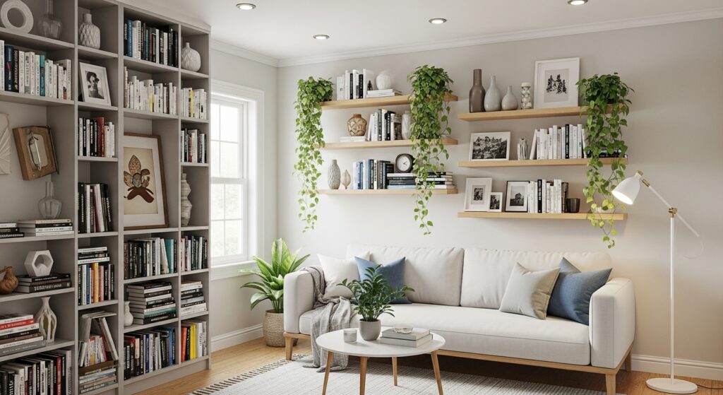 • Floating shelves: Use them to display plants, books, or art while keeping the floor clear.