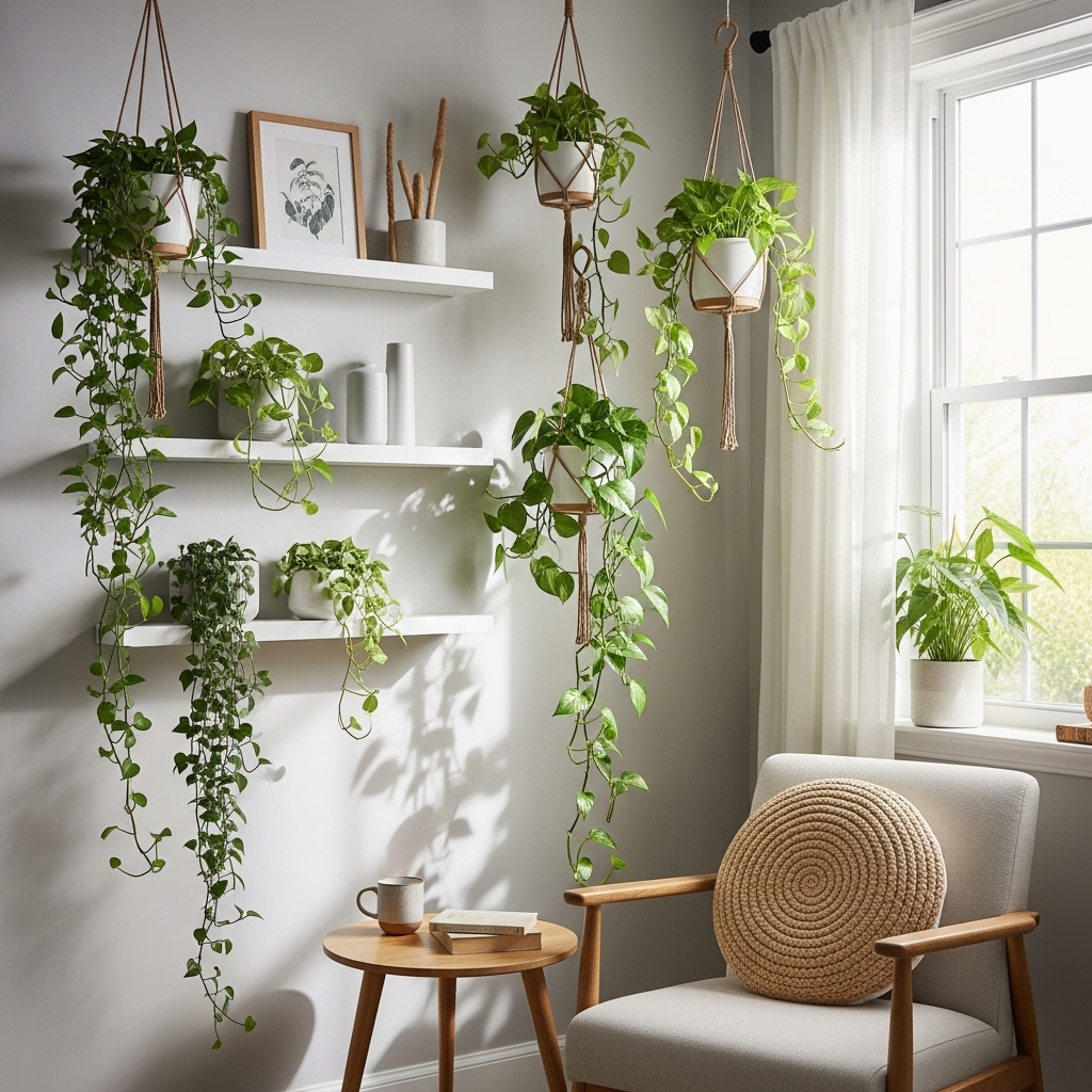 • Hanging planters or lights: Free up surfaces by suspending decor from above.