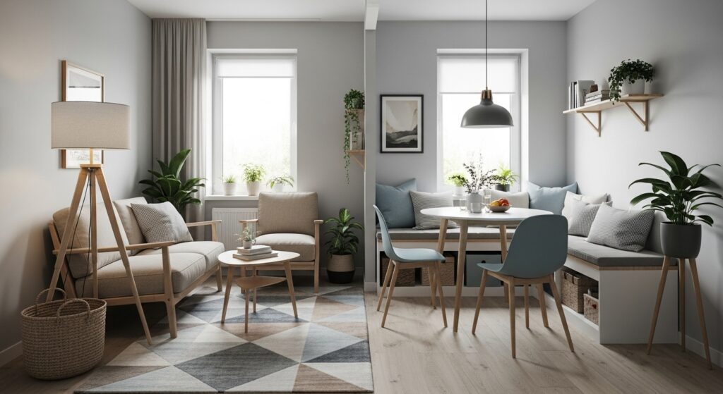 In small spaces, defining separate zones helps bring structure and purpose to each area — even in an open-plan layout.
