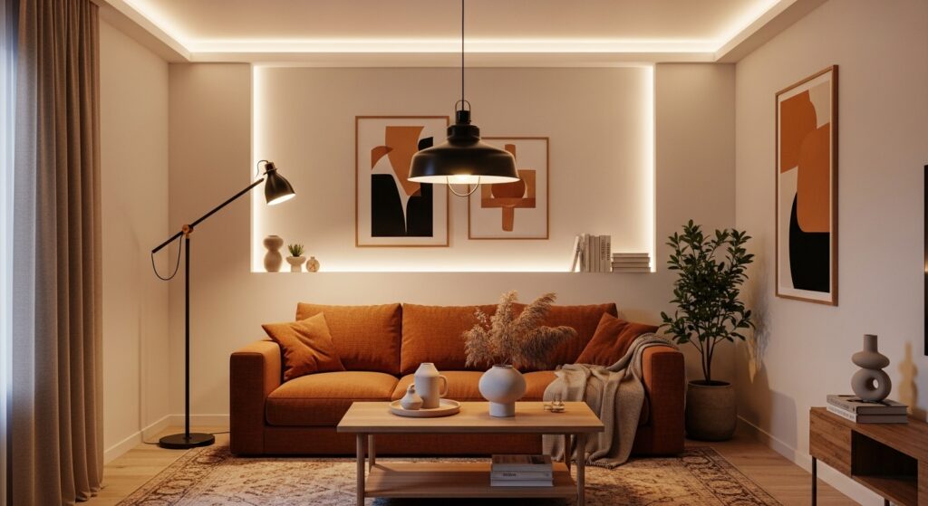 • Accent lighting: Highlights decor features, like art or plants.