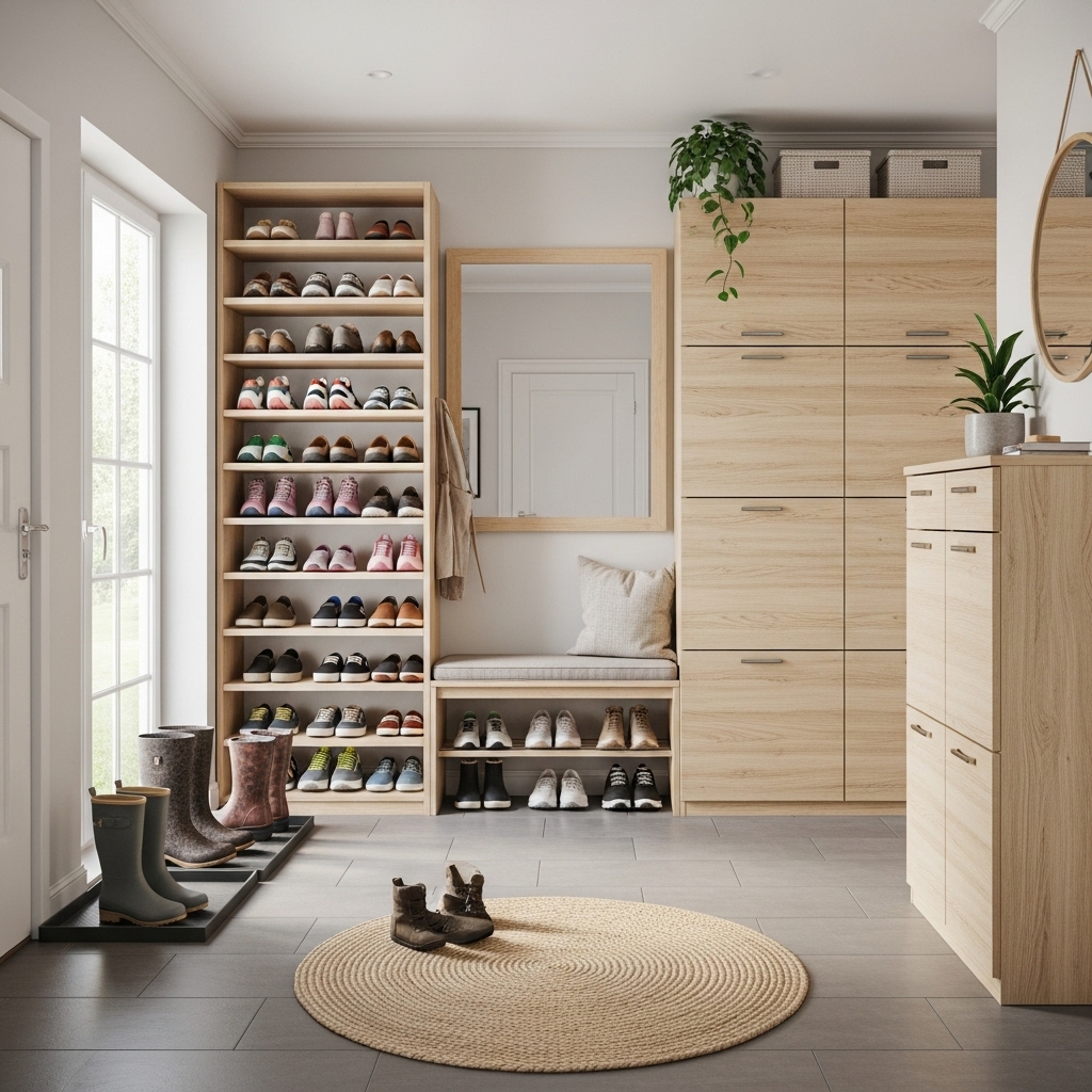 Shoes are often the biggest source of entryway clutter. The key is choosing a storage solution that matches your family’s habits.