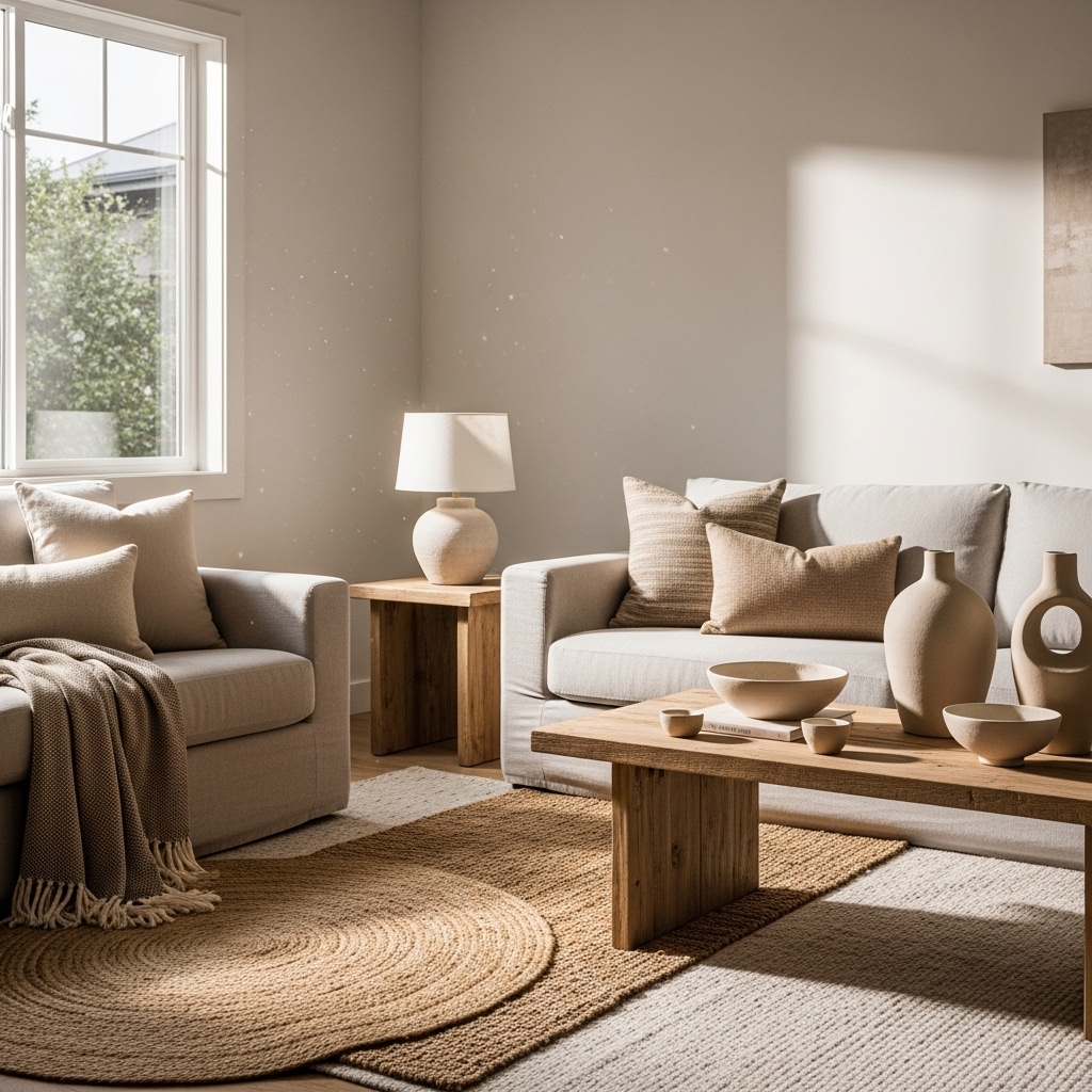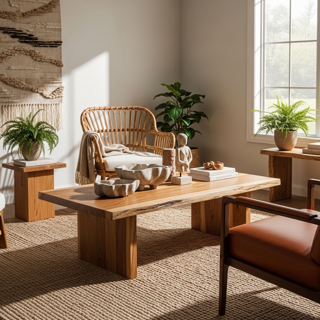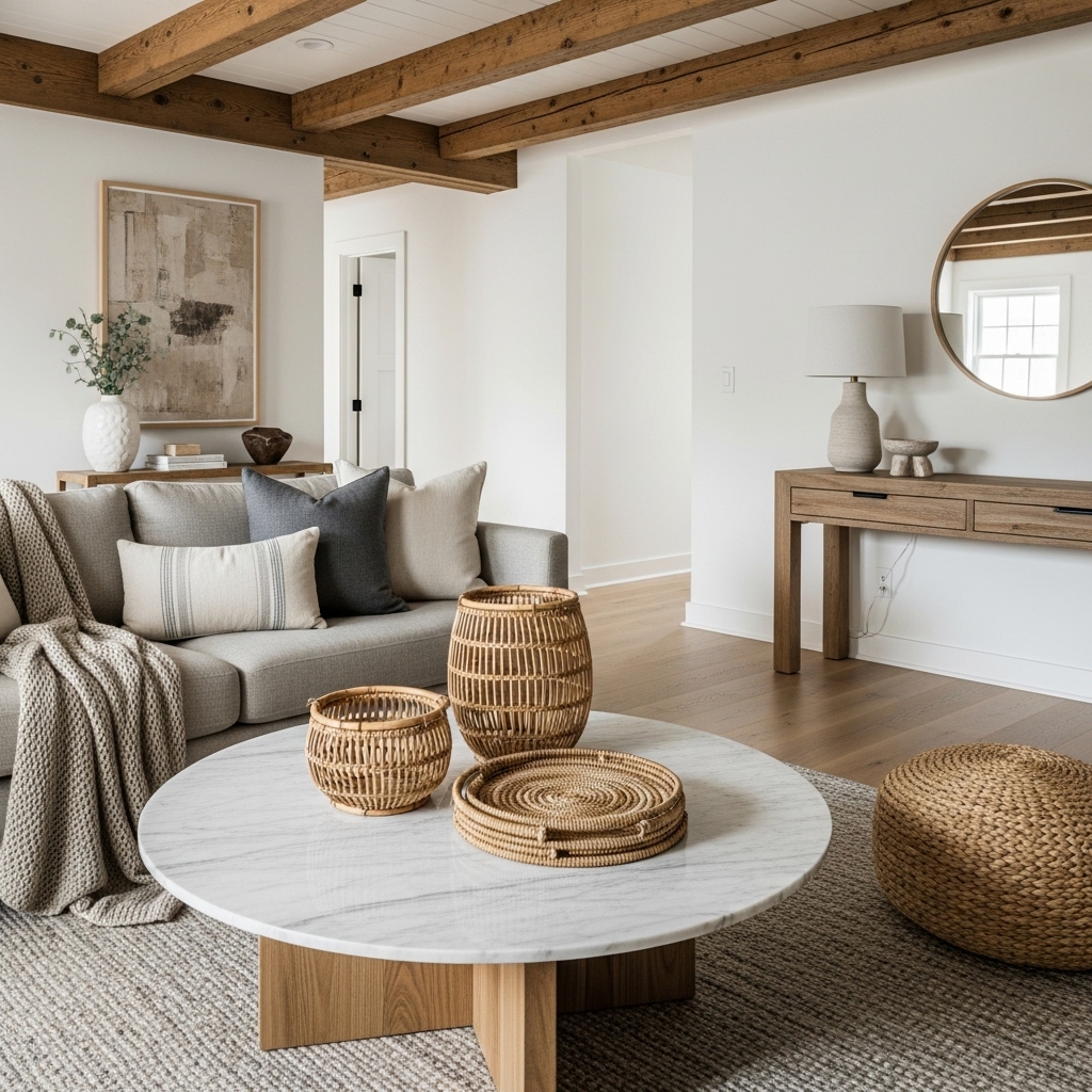 A wooden coffee table with visible grain, a stone side table, or a leather accent chair instantly elevates the room. Woven baskets, rattan trays, or bamboo décor pieces add subtle texture while keeping the space relaxed and approachable.