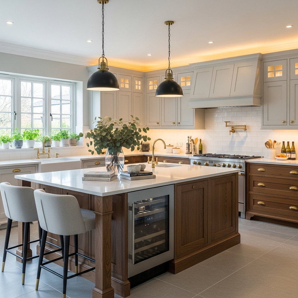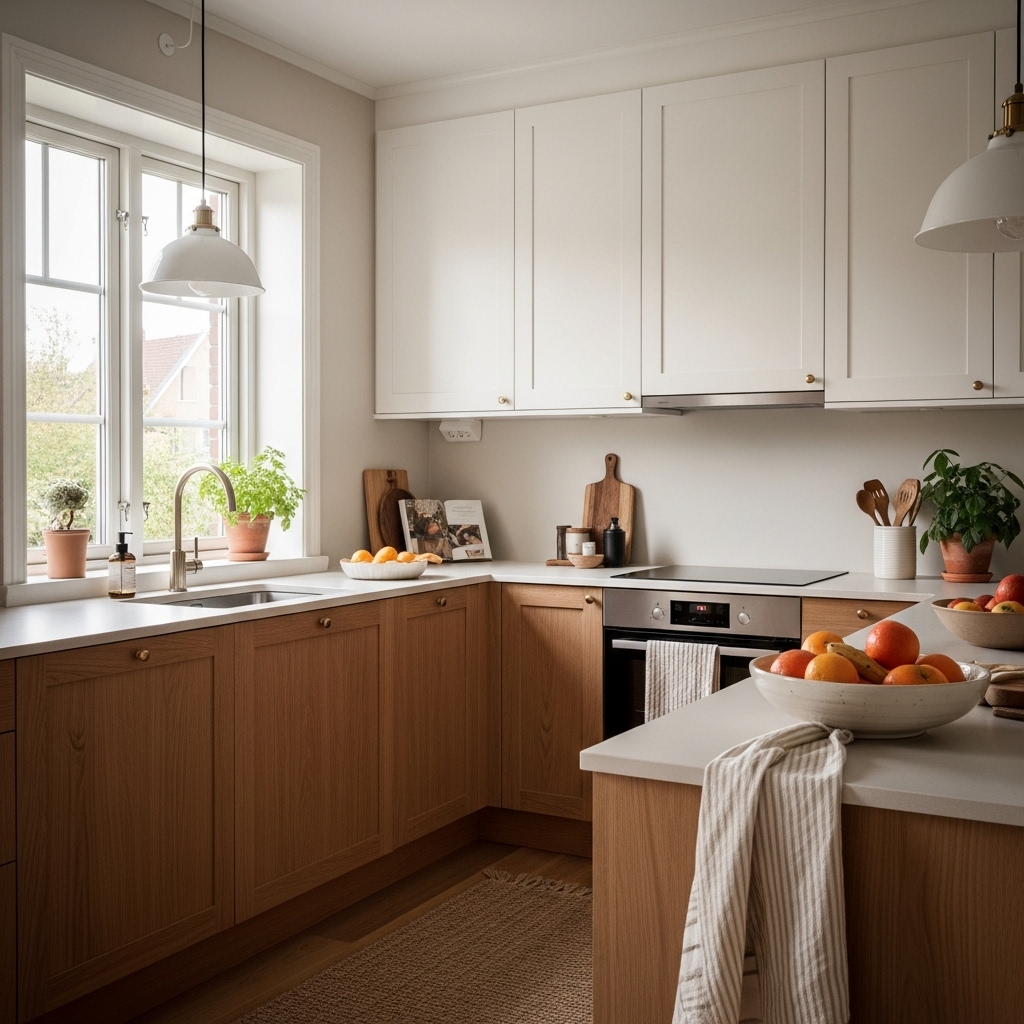 Combining crisp white cabinets with warm wood finishes creates a cozy yet refined look. This option is perfect for homeowners who want a natural, welcoming kitchen without sacrificing brightness.