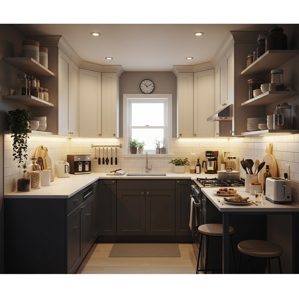 Open shelving, glass-front cabinets, and minimal hardware can further enhance the spacious feel when paired with a Two-Tone Kitchen Cabinet Idea.