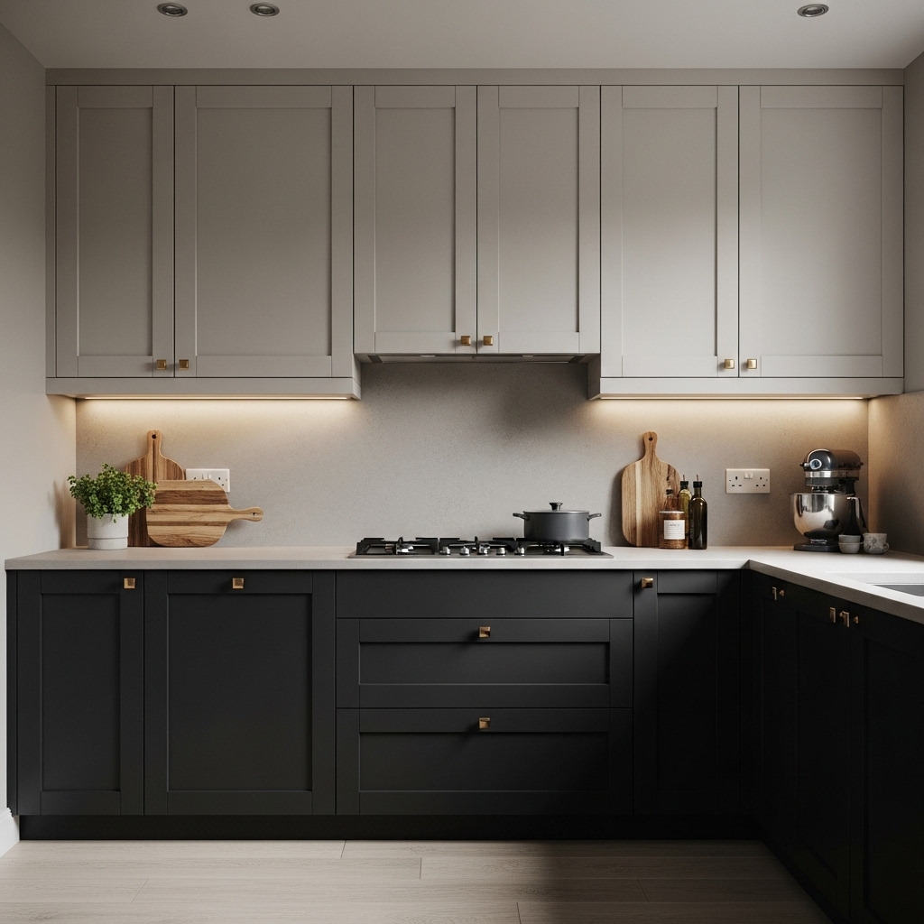 - Visual depth: Two colors prevent the kitchen from feeling flat