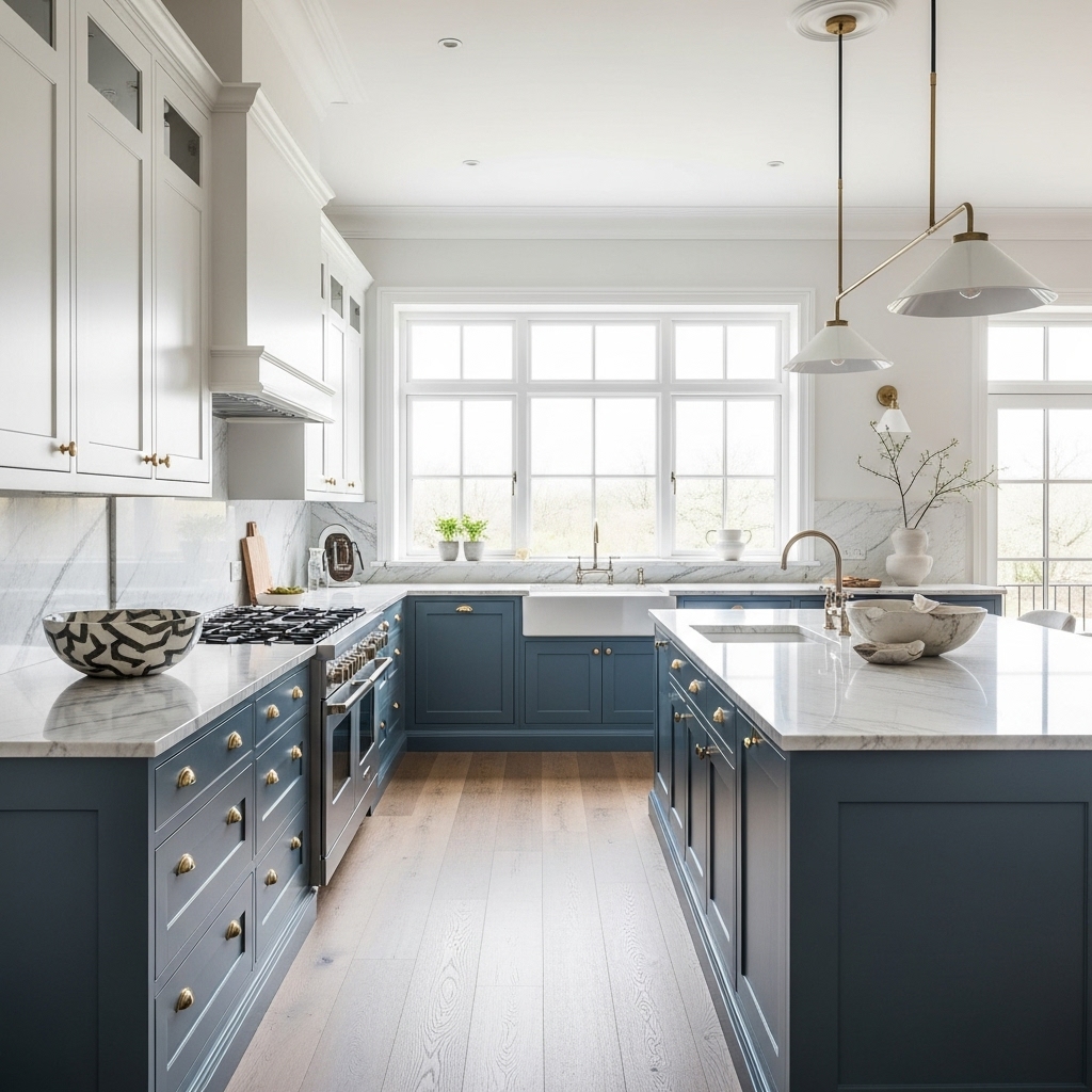 Traditional kitchens benefit from softer contrasts such as cream and gray or white and navy. Decorative molding, classic hardware, and warm finishes add timeless charm to two-tone designs.