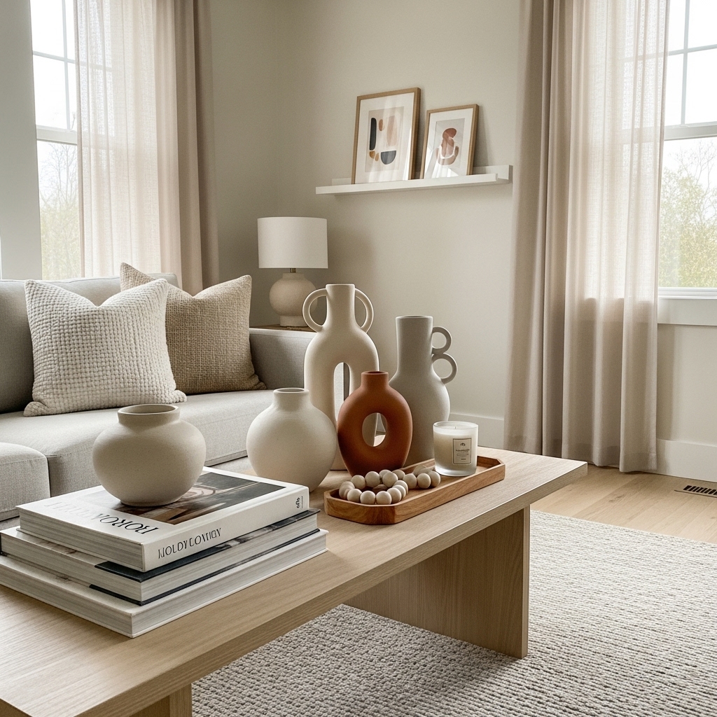 The secret is layering. Combine different shades, textures, and finishes. Mixing smooth ceramics with rough wood or soft textiles keeps living room decor warm neutral visually interesting.