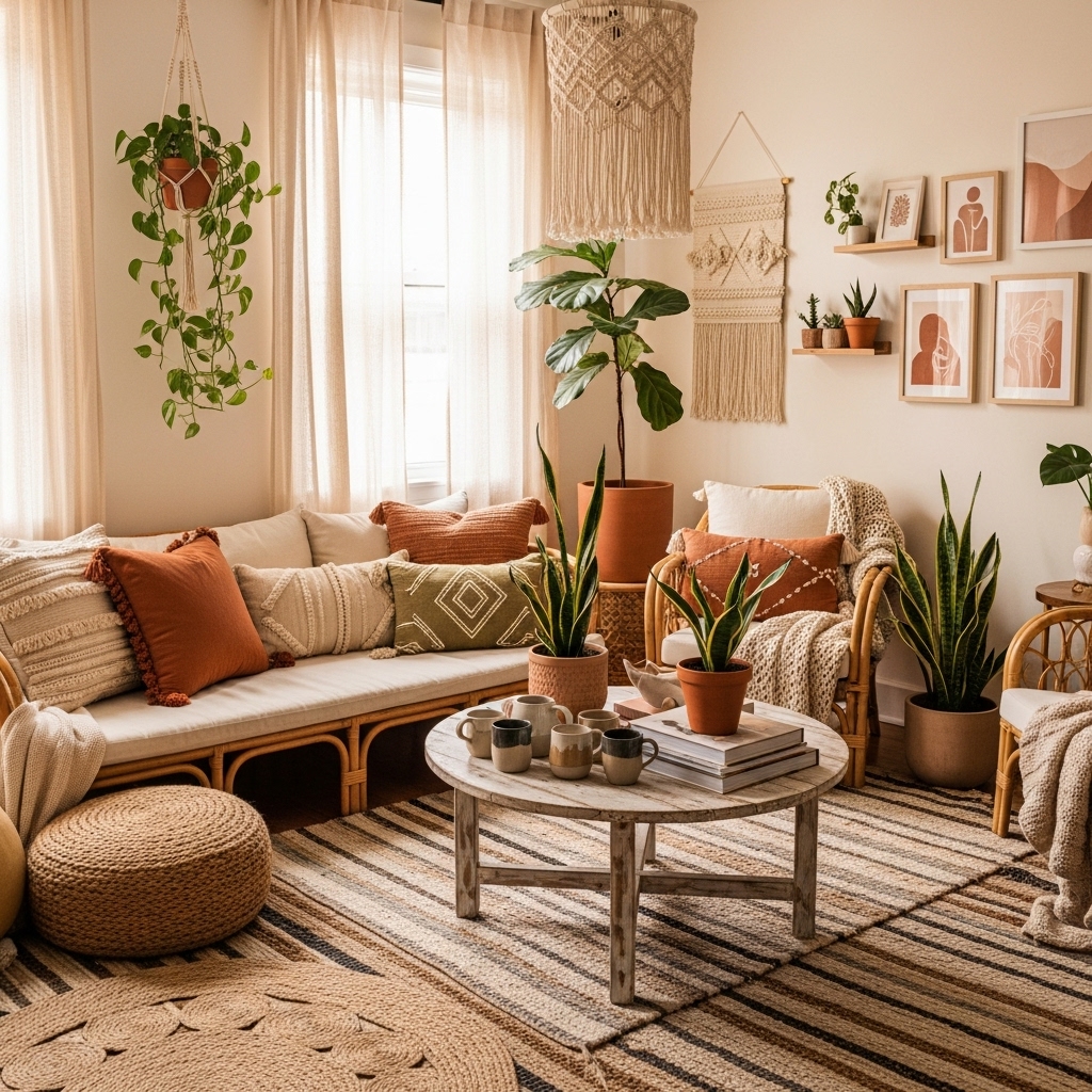 - Add macramé, rattan, or vintage accents