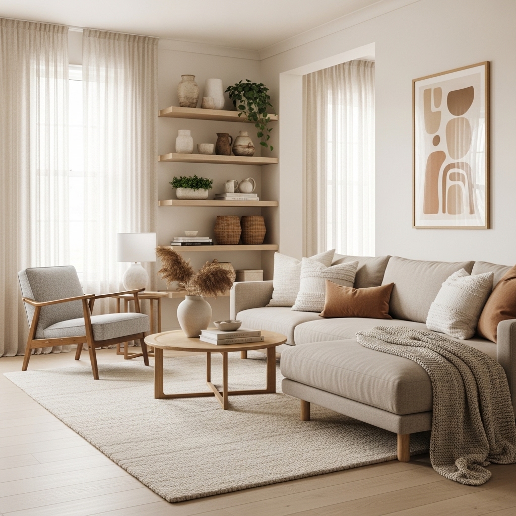To achieve warm neutral living room cozy decor, layer textures like knit throws, plush rugs, and soft cushions. Warm lighting and natural materials also help create that inviting, lived-in feel.