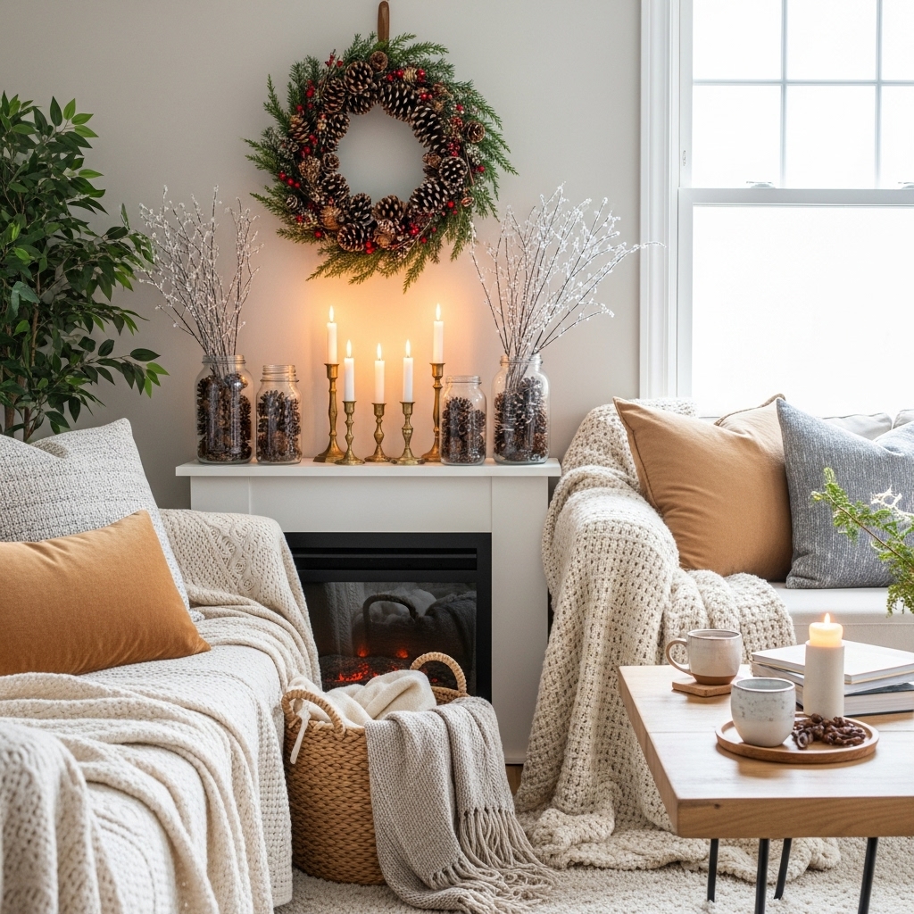Start with a neutral color palette—creamy whites, warm taupes, and gentle grays. Then, add cozy layers like chunky knit throws, faux fur blankets, and wool pillows. Minimalist winter décor shines when textures do the talking.