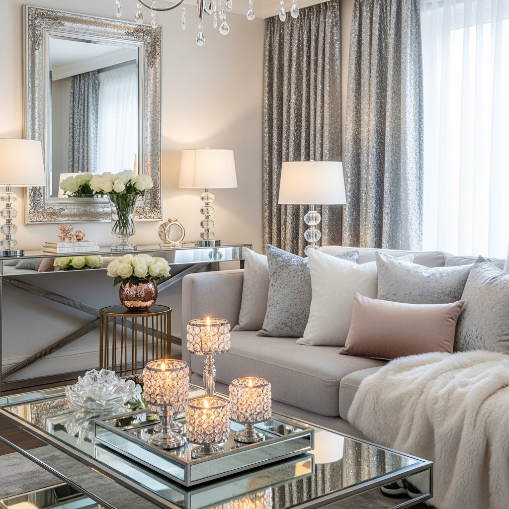 Think crystal candle holders, glass ornaments in decorative bowls, and mirrored trays. These help reflect soft winter light around the room.