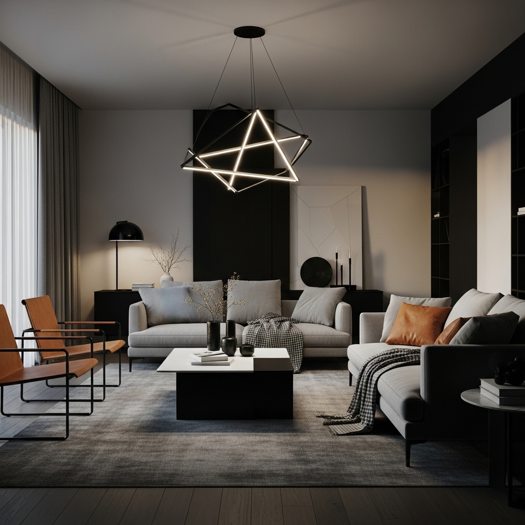LED floor lamps, geometric light fixtures, and statement sconces help elevate the look.
