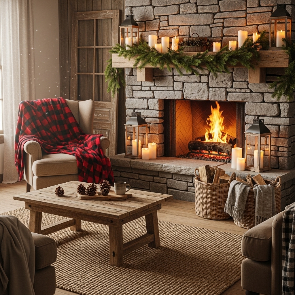 If you have a fireplace, decorate the mantel with pinecones, winter garlands, chunky candlesticks, or vintage lanterns.