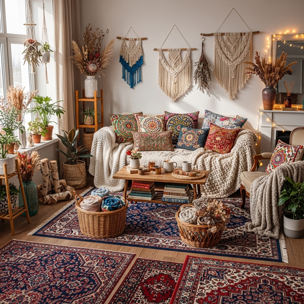 Boho décor brings warmth and personality into your winter living room with rich textures, earthy tones, and eclectic touches.